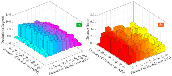 Figure 13b), when the pressure of pneumatic module two varies from 0 to 40 kPa, that of module one stays unchanged at 40 kPa. It can be seen from