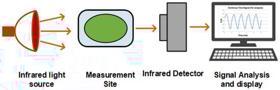 NIR spectroscopic imaging is employed to study the atmosphere, plants, and soil. NIR spectroscopy in material sciences is used in measuring the film thickness of microscopic samples and analyzing optical characteristics of nanoparticles and optical coatings. In the medical field, NIR spectrometry is used in medical imaging and physiological diagnostics []. It is now an established name for the analysis of body fluids and blood, for example, in ergonomics, sports training equipment, pulse oximetry, functional neuroimaging, medicine, neonatal research, brain-computer interface, urology, and neurology. NIR spectrometry still has more potential and is an active research area field [].