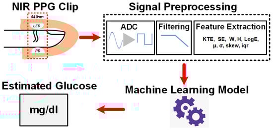 Block diagram of the NIR PPG signal glucose sensing platform with machine learning.