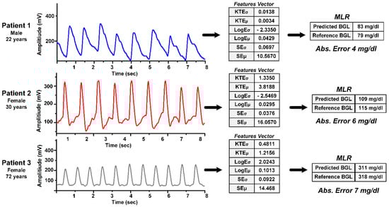 Monte-Moreno’s study [] is one of the initial works which investigates noninvasive BGL estimation using PPG signals with machine learning algorithms. This system also measures blood pressure and heart rate using the same recorded PPG signals, and 410 individual data are recorded. The designed module also mitigates motion artifacts and rejects noisy recorded signals. After signal processing, main features are extracted, and a feature vector of fixed length is formed. This feature vector is input into the machine learning module. The PPG signals are recorded for a 1 min duration. Each signal is segmented into overlapping frames of length 5 s. Both segmented and unsegmented signals are input to the feature extraction unit. The statistical features extracted from input signals are mean, variance, skewness, and interquartile range (IQR) of Kaiser Teager Energy (KTE), heart rate (HR), spectral entropy (SE), IQR, and variance of Log Energy (LogE) profiles. Autoregressive (AR) coefficients of order 5 from the PPG waveform, KTE, and LogE are also computed. Other non-statistical features include oxygen saturation range (OSR), age (AG), weight (WGT), and body mass index (BMI). The feature vector (XF) is formed by concatenating all the features. This feature vector is input to the machine learning module. In total, a 33-dimensional feature vector is formed from 20 distinct features given by: