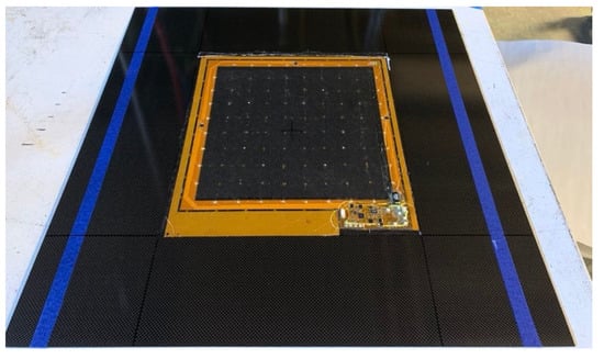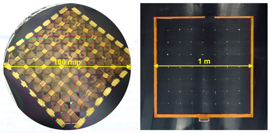 As noted, SACL at Stanford University has previously developed a multifunctional network called the SSN [35,36,39]. This network supports strain gauge, RTD, and lead zirconate titanate (PZT) sensors with real-time data acquisition, and can be expanded from a 100 mm diameter wafer footprint to a square footprint of one square meter: a 100-fold area increase, shown in Figure 1. The SSN has been deployed in composite structures to monitor loads, impacts, damage, and temperature in real time.