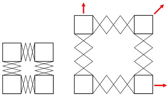 A square formation of scissor-hinge mechanisms expands as desired, with the bottom left block remaining stationary. Red arrows indicate the movement paths of the remaining blocks.