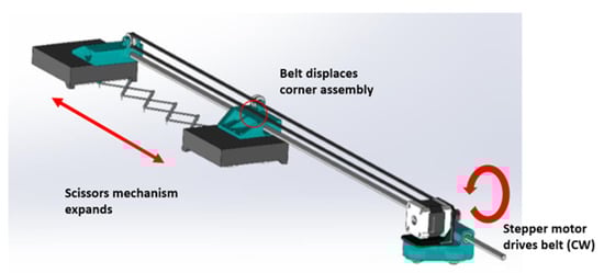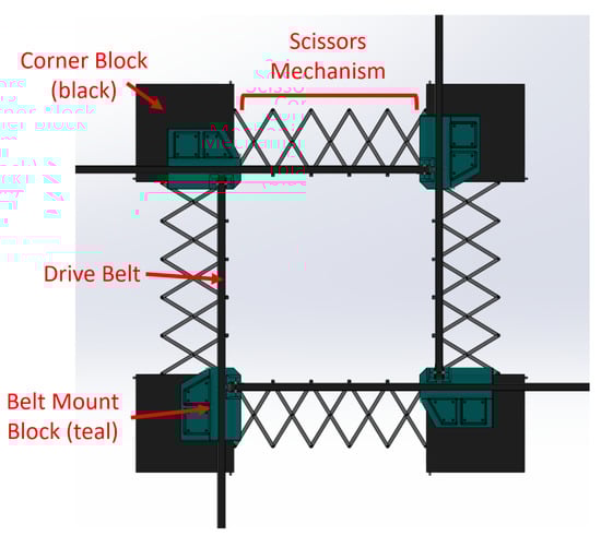 In order to characterize the minimum amount the scissor hinges can move, the kinematics of the scissor-hinge expansion must be considered. The minimum amount the scissor hinges can move is directly related to the pitch of the belt and gear assembly; these quantities must be chosen to produce sufficiently high-resolution movement.