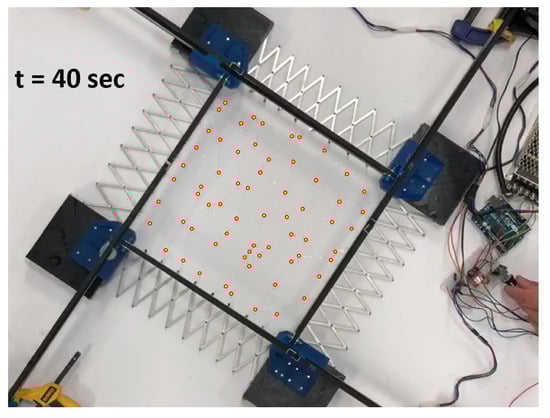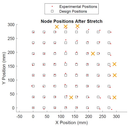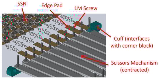 A number of approaches for integrating such multifunctional sensor networks within large-area structures have been proposed and implemented within the past decade [4,19,20,21,22,23,24,25,26,27,28,29,30,31]. In this study, the focus is on the stretchable sensor network (SSN) developed at the Stanford Structures and Composites Lab (SACL) as well as many similar technologies often described as “island-and-serpentine” networks [3,13,14,22,23,32,33,34,35,36,37,38,39,40,41]. These networks comprise an array of sensor nodes connected to each other by coiled serpentine interconnects capable of expanding via rigid body rotation, preserving their resistivity as they are opened. Such networks are a compelling solution for the integration of multifunctional sensor networks within a large-area structure or part, providing a platform that can be manufactured at microscale and deployed at macroscale in a non-parasitic, simply packaged way. In this study, the aim is to enable such networks to be deployed in a safe, automated, and efficient manner, facilitating their use in a variety of tasks including structural health monitoring, medical devices, antennas, and electrodes. This is achieved using a proposed “stretch tool” capable of stretching uniform networks with a series of scissor-hinge mechanisms. The kinematic principles of the device are explained, a prototype is developed, and two test runs are conducted to determine the appropriateness of the tool for expanding SSNs. Specifically, the device is evaluated based on its preservation of the network during stretching (i.e., no broken or tangled interconnects), the process time of the stretching process, which should be on the order of one minute, and the accuracy of the tool in deploying nodes in their design positions, characterized by the mean positional error in the positions of the final nodes from a uniform grid.