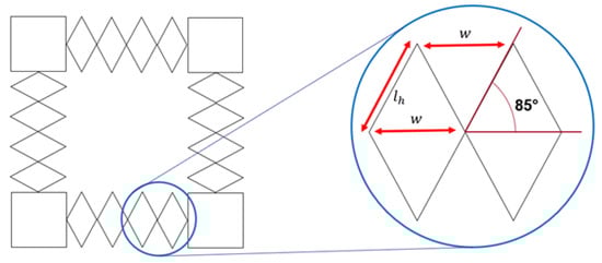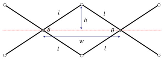 Scissor-hinge mechanisms are built up of scissor-hinge units. A translational deployable scissor-hinge unit consists of two straight links connected to each other at intermediate points. Scissor-hinge units of this type have well-defined kinematics. The units in the proposed tool are the simplest kind: all links are of equal length l and interior angle . Distances w and h are also defined in Figure 7.