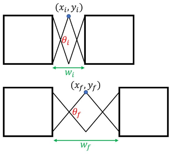 Let the angles associated with the scissor-hinge mechanisms be and for the horizontal- and vertical-running mechanisms, respectively. Let a be the side length of one corner block, w be the horizontal hinge-to-hinge distance, h be the vertical hinge-to-hinge distance, be the half-length of the vertical hinge link, and be the half-length of the horizontal hinge link. Then, a set of kinematics equations can be derived as follows: