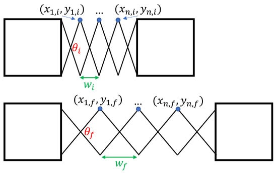 This set of kinematics equations expresses the positions of each interior point of the scissor-hinge mechanisms in terms of the opening angles and . However, these parameters are not directly controlled by the user. Rather, the mechanism is controlled as shown in Figure 4, i.e., by expanding the entire scissor-hinge mechanism along its length. As such, the variables W and H are introduced to represent the length of each scissor-hinge mechanism: W corresponding to the length of the mechanisms along the x direction and H corresponding to the length of the mechanisms along the y direction. Now these control parameters can be related to the positions of each interior point: