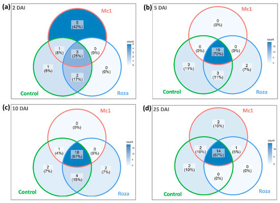 Venn diagrams showing common and unique peaks represented by different retention times extracted from GC-FID data of wild potato species, SB22 plants infected with M. chitwoodi Race 1 (Mc1), and its pathotype Roza across different days after inoculation (DAI). (a) 2 DAI, (b) 5 DAI, (c) 10 DAI, and (d) 25 DAI.