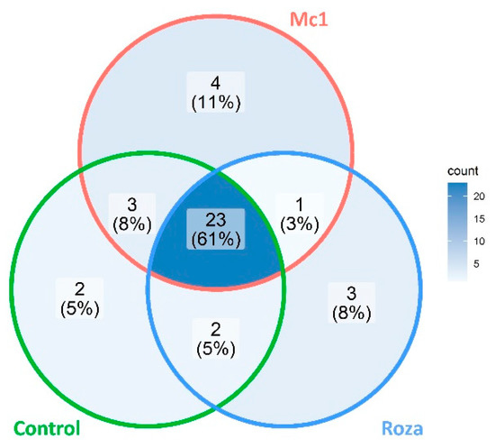 Venn diagram showing common and unique peaks represented by different retention times extracted from GC-FID data of SB22 plants infected with M. chitwoodi Race 1 (Mc1) and its pathotype Roza by combining all time points (2, 5, 10, and 25 DAI).