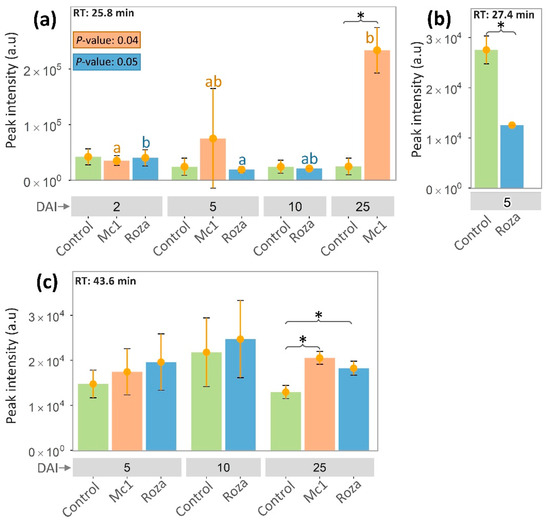 Peak intensity of three common retention times across different days after inoculation of SB22 plants with M. chitwoodi Race 1 (Mc1) and its pathotype Roza. Retention time: (a) 25.8 min, (b) 43.6 min, and (c) 27.4 min. * p-value < 0.05 from t-test analysis. Different letters in each column by nematode race denote significant differences in peak intensities across DAIs at p < 0.05 using Tukey’s test.