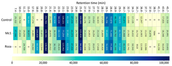 Heatmap (Figure 4) of average peak intensities of VOCs across the combined dataset shows variations in VOCs emission profiles between control, Mc1 inoculated, and Roza inoculated SB22 plants. In general, VOC peaks at 21.5, 23.1, and 25.9 RTs showed the highest peak intensities across the samples, although the differences were not statistically significant.