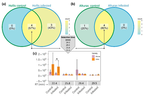 Venn diagram showing common and unique peaks represented by different retention times extracted from GC-FID data of samples from resistant and susceptible wheat infested with Hessian fly. Comparison of (a) number of peaks from Hollis infested and control wheat data, (b) number of peaks from Alturas infested and control wheat data, and (c) peak intensity of four common retention times between both cultivars and treatments. * Significant differences from t-test analysis (p-value < 0.05).