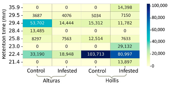 In this study, interestingly, both plant cultivars exhibited the same four common peaks (Figure 5a,b). The greatest average peak intensity (p-value < 0.05) was found at 22.4 min RT where Hollis infested samples showed 4.3 times higher average peak intensity than Alturas infested samples (Figure 5c). Since this peak was also found to be higher in Hollis control samples, further investigations may be needed. Heatmap shows that the three induced VOC peaks from Hollis-infested samples were at 21.4, 23.0, and 35.9 RTs (Figure 5a and Figure 6).