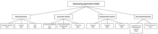 In this section, we use the Pythagorean fuzzy entropy in the COPRAS approach for assessing five agriculture fields . An agricultural scientist reviews for specific points, incorporating a short priority sheet for checking the agriculture field. The priority from an agricultural scientist (decision-maker) for a particular criterion has been taken in terms of linguistic variables – Excellent, Good, Average, Poor, and Very Poor are used in this research paper to determine the standard level. For a particular criterion, the agricultural scientist will indicate the degree of priority level on a discrete scale of 1 (Very Poor) to 5 (Excellent). The broad category of the priority sheet has been chosen to be a physical factor, economic factor, infrastructure facilities, and government policies. Further, in the priority sheet, these categories have been sub-divided into eleven different evaluation criteria from top to bottom in the framework shown in Figure 1. Four primary criteria classifications were considered, i.e., Physical, Economic, Infrastructure, and Government policies. The Physical factors included criteria mainly related to cultivation, such as irrigation facilities (), climate (), and solid (). The economic factors included attributes related to the economics of maintaining agricultural fields, such as insurance against risk (), price and income maximization (), and farm size (). For Infrastructure factors, storage (), irrigation (), and transport () were selected. Finally, for Government policies, the criteria were legislative and administrative policies () and the green revolution ().