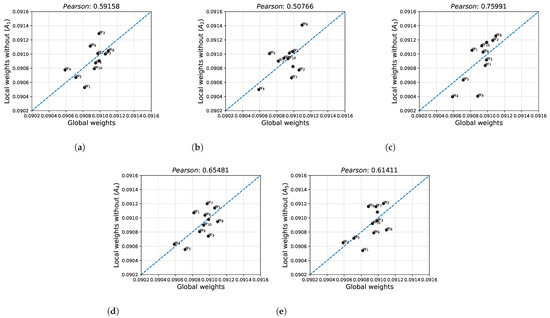 Using Figure 4, the Pearson’s coefficient values for the obtained scores from the COPRAS method when changing the threshold value for criteria – are shown. The Pearson correlation values are in the range [1.00, 0.97], indicating highly similar scores from the given approaches. The smallest correlation values were obtained by the approach in which criterion a threshold value modified . On the other hand, the highest correlation values were obtained by the approach in which a threshold value modified criterion . The lowest correlation with reference scores was obtained with the approach where criterion was modified by a value of 0.05. On the other hand, the highest correlation with reference scores was obtained with the approaches where the threshold value was included in criterion and .