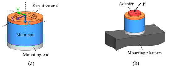 Figure 1 depicts the typical structure and the usage of the triaxial force transducers commonly used today. As can be seen, the structure of the transducer can be divided into three parts: the mounting end, the sensitive end and the main part. In practical use, the transducer is held on a platform by its mounting end. A specially designed adapter is usually required to capture and transfer the force to be measured to the sensitive end of the transducer. The sensitive axes of the transducer will then detect the force transferred to the sensitive end and output it as a three-channel voltage signal. The sensing components of transducers are encapsulated in the main part. In this paper, the sensitive axes of the triaxial transducer are represented by , and , as shown in Figure 1a.