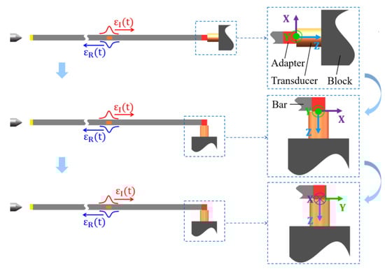 For the triaxial force transducer, the principle of its calibration using the Hopkinson bar is shown in Figure 3. The transducer being calibrated was fixed on a mounting block. The block constrained the degrees of freedom of the transducer. A cubic adapter was adopted to capture and transfer the input force for the transducer. The sensitive axes of the triaxial force transducer were tested sequentially by the Hopkinson bar. The attitude of the transducer, as well as the position of the mounting block, had to be changed so that the direction of the force could always be aligned with the direction of the sensitive axis. It is worth noting that in the calibration, shown in Figure 3, only one of the three sensitive axes of the transducer had force input in each test. However, all the three sensitive axes would have voltages output at the same time, due to the coupling between the sensitive axes. Therefore, in this particular case, there would be only one non-zero element in the column vector of the force matrix in Equation (10), and the other two elements would both be zero. However, the elements in voltage matrix would all be non-zero elements.