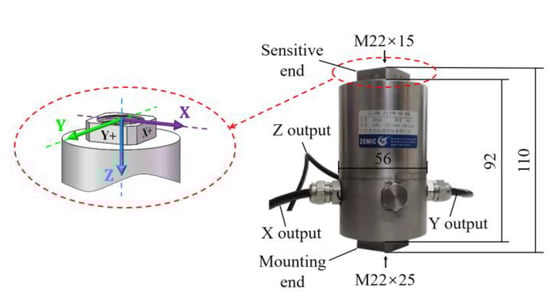 The triaxial force transducer used in this paper was a B25B piezoresistive transducer, as shown in Figure 4, provided by AVIC (Aviation Industry Corporation of China, Ltd., Beijing, China). Table 1 lists the characteristic parameters of the B25B transducer. The main axis sensitivity coefficients of the transducer given in Table 1 were obtained using a static method. The transverse sensitivity coefficients of the transducer were unknown before this paper.