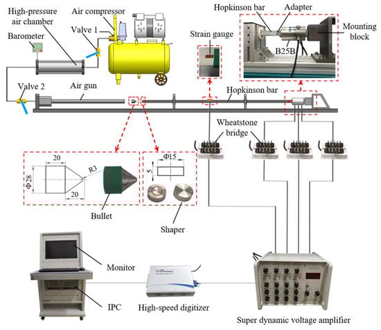 The calibration system, established based on the Hopkinson bar, is shown in Figure 5. An air gun was adopted to launch the bullet. When valve 2 was closed and valve 1 was open, the high-pressure air chamber would be inflated by the air compressor. A barometer provided the real-time display of the air pressure in the chamber. When the pressure in the chamber reached an expected value, valve 1 should be closed to stop inflation. At this point, the bullet would be launched by the high-pressure air once valve 2 was opened. The bullet used was made of a 45# high-strength steel. Its geometry and dimensions are given in Figure 5. The velocity of the bullet could be adjusted by changing the pressure in the chamber at the moment of launching. The shapers used were made of a 2024 aluminum alloy. The dimension of the shaper was . The Hopkinson bar used was made of a 7075-aluminum alloy. The bar was a square bar with a section of 20 mm 20 mm and a length of 1800 mm. The adapter used was a cube with a side length of 20 mm. It was connected rigidly to the transducer with a thread of M22 15. The adapter, as well as the mounting block and its supporting, were all made of 45# high-strength steel.