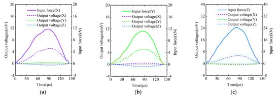 In the experiments, the Z-axis of the transducer was tested by the bullet at pressures of 0.05, 0.1, 0.15, 0.2, 0.25, 0.3 and 0.35 MPa. The X-axis and Y-axis of the transducer were tested at pressures of 0.05, 0.075, 0.1, 0.125, 0.15, 0.175 and 0.2 MPa. The typical input forces and output voltages of the transducer are shown in Figure 6. Specifically, the forces and voltages in Figure 6a were recorded in the case where the X-axis was tested at the pressure of 0.15 MPa. The forces and voltages in Figure 6b were recorded in the case where the Y-axis was tested at the pressure of 0.15 MPa. The forces and voltages in Figure 6c were recorded in the case where the Z-axis was tested at the pressure of 0.3 MPa. It can be seen that the duration of the force pulses excited by the bullet was about 140 μs. In addition, the amplitude of the force pulse increased with the pressure, while the duration of the pulse seemed to be independent of the pressure. On the other hand, it can be seen from Figure 6 that, although only one of the three sensitive axes of transducer had force input, the other two axes would also have voltages output at the same time. This indicated that coupling effects existed between the sensitive axes of the transducer. Moreover, the coupling between X-axis and Y-axis was positive, and the coupling between Z-axis and X-axis, as well as the coupling between Z-axis and Y-axis, were both negative, as illustrated in Figure 6.