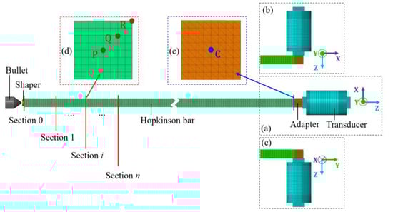 In this section, the numerical model of the calibration system was built using the commercially available finite element software ADAQUS (Version 2017, Dassault Aviation, Paris, France). A number of simulations were then conducted to investigate the validity and the calibration range of the newly proposed method. The typical model built is shown in Figure 7. Specifically, Figure 7a shows the numerical model, wherein the Z-axis was tested. Figure 7b shows the numerical model wherein the X-axis was tested. Figure 7c shows the numerical model wherein the Y-axis was tested. In addition, a typical cross section of the Hopkinson bar is shown in Figure 7d. The points P, Q, and R were the sampling points on the cross-sections. The surface of the adapter in contact with the bar is shown in Figure 7e. The center point C was the sampling point on this surface.
