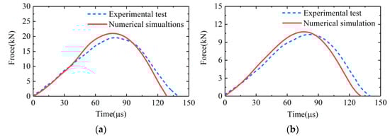 In order to verify the numerical models, we conducted experimental tests and numerical simulations using the same bullet and at the same impact velocities. Figure 8 shows the comparisons of the input forces of the transducer obtained from the experiments and the numerical simulations. Specifically, the force pulses in Figure 8a were obtained from the experimental test and numerical simulation wherein the Z-axis of the transducer was tested at the velocity of 20 m/s. The force pulses in Figure 8b were obtained from the experimental test and numerical simulation wherein the X-axis of the transducer was tested at the velocity of 12 m/s. It can be seen that the force pulses obtained from experimental tests and numerical simulations were in good agreement. So, the numerical models built could be considered valid and accurate to simulate the experimental tests. The slight differences between the amplitude and the duration of the force pulses obtained from experiments and simulations might be due to damping and defects of material [20], which were not taken into account in the numerical simulations.