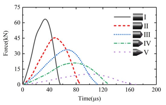 Figure 10 shows the waveforms of the input forces of Z-axis excited by the bullets with various geometries. The bullets Ι–V in Figure 10 were all 40 mm in length and all had a maximum diameter of 28 mm. The impact velocity of the bullets was 20 m/s. It can be seen that the waveform of the input force was related to the geometry of the bullet. To be more exact, it was related to the taper at the impact end of the bullet. The input force pulse excited by the bullet with a smaller taper at its impact end had a lower amplitude and a wider duration. Yet, the input force pulse excited by the bullet with a larger taper had a higher amplitude and a shorter duration. For an extreme case, the input force pulse excited by bullet Ι, a cylindrical bullet with a maximum taper at its impact end, had the highest amplitude and the shortest duration.