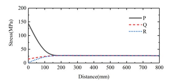 In order to study the influence of wave propagation, a series of cross sections were selected at 10 cm intervals along the bar, as shown in Figure 7. The P, Q, R points were the sampling points on each section (Figure 7). Let , , be the stress amplitude at the points P, Q, R, respectively. The values of , and on each of the selected sections were recorded. Figure 11 shows the typical trends of the , and along the bar. It can be seen the stress distribution on the impact end face of the bar had a significant dispersion. A certain distance was required for the stress to reach a uniform distribution across the section of bar. The distance in Figure 11 was about 160 mm, 8 times the diameter of the bar. Fortunately, the stress wave would propagate with almost a constant amplitude once the stress distribution reached a uniform state. Therefore, the attenuation of the stress amplitude caused by the wave propagation was negligible.
