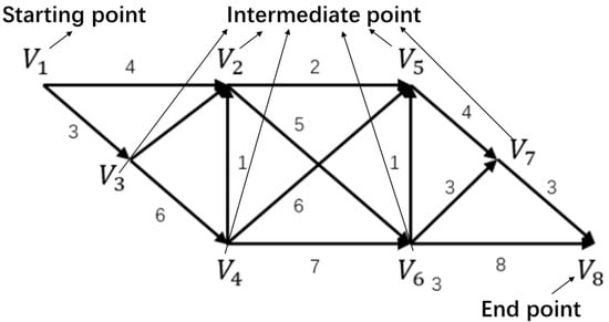 This paper mainly uses an algorithm proposed by Dijkstra [39,40], which is recognized as a good algorithm for our modeling purpose. This algorithm is called the labeling method or the Dijkstra algorithm. It can find the shortest path from the starting point V1 to the end point V8 and obtain the shortest path from the starting point to any point.