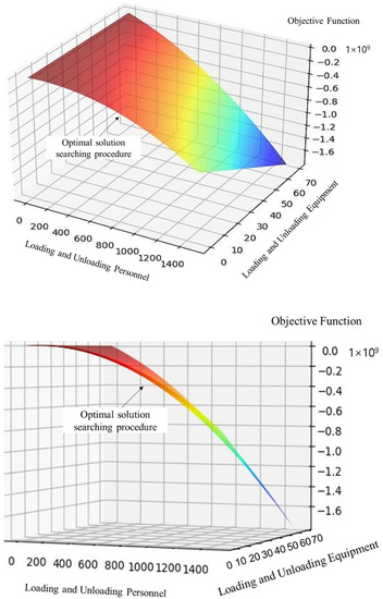 When the objective function reaches the lowest point, the transportation time is 70 days. The total number of loading and unloading personnel required at the five transfer sites is 1280, and the total number of transportation personnel is 120. The total cost is 7.702 million, and the total number of loading and unloading equipment is 70 sets. We also calculate the results with the fuzzy eclectic planning algorithm for comparison purposes. The results are summarized in Table 2. It can be found that the gradient descent algorithm applied in our study outperforms the fuzzy eclectic planning for the shortest path problem. More specifically, the gradient decent algorithm improves the total transportation time by 7.89%, the entire personnel by 10.35% to 17.31%, total cost by 13.58%, and total equipment by 7.89%. The results demonstrate the advantages of the gradient descent algorithm for large-scale network optimizations.