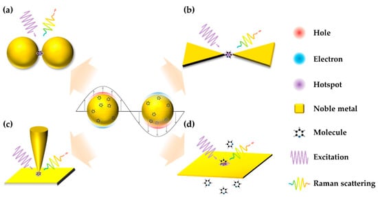 Surface-enhanced Raman spectroscopy (SERS) significantly enhances the Raman signal beyond the sensitivity limit of Raman spectroscopy [3]. In general, surface-enhanced Raman scattering occurs on molecules adsorbed on the rough surface or nanostructure of noble metal substrates. It is generally accepted that SERS enhancement is the result of electromagnetic mechanisms (EM) and chemical mechanisms (CM) [4,5]. EM enhancement is the dominant contribution of SERS. Surface plasmon resonance (SPR), the collective oscillation of free electrons excited by photons, localizes the electromagnetic field on the surface of the substrate. The strong, localized electromagnetic field amplifies the Raman signal of molecules adsorbed on the substrate. CM, providing less enhancement than EM, is employed as a complementary approach. The Raman polarizability tensor of analyte molecules is modified by charge transfer between molecules and hot electrons.