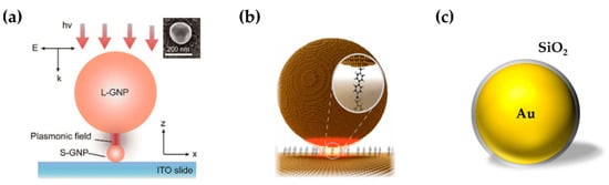 Monitoring of catalytic reactions by SM-SERS. (a) The Au dimers, consisting of two nanoparticles sized 200 nm and 13 nm. Figure reproduced from [95]. Inset: an SEM image of the Au dimers. L-GNP, large gold nanoparticles. S-GNP, small gold nanoparticles. ITO, indium tin oxide. (b) Self-assembled 80 nm NPoM for eliciting EF for SM-SERS. Figure reproduced from [96]. (c) SHINERS, Au core SiO2 shell nanoparticles.