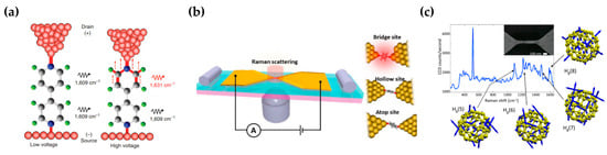 Liu et al. [64] observed voltage-dependent peak splitting due to the different bonding interactions occurring on the Au–4bipy–Au junction (4,4′-bipyridine, 4bipy) by FM-TERS (Figure 5a). Kaneko et al. [100] studied the selectivity of adsorption sites in a single-molecule junction by simultaneous SERS and conductance measurements (Figure 5b). The conductance response revealed the coexistence of three metastable states in 1,4-benzenedithiol (BDT) junctions. The SERS results showed selectivity of adsorption site toward “bridge sites”. Han et al. [101] studied the influence of SPR on interfacial charge transfer in TiO2–MBA–Au assemblies (MBA, mercaptobenzoic acid) by SERS. Li et al. [102] studied voltage tuning of vibrational mode in C60 junctions (Figure 5c). Applying a bias to the junction, vibrational mode softening approximately quadratic in the bias voltage occurs. This stark effect alone cannot explain the phenomenon, but alteration of the molecular charge state is responsible for the effect.