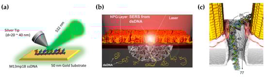 A plasmonic nanopore is a single-molecule sensor widely used in solution at room temperature. The electrolyte solution is divided into two chambers by an electrically insulating membrane on which the nanopore is a nanoscale aperture. A bias voltage applied across the membrane drives the charged analyte through the nanopore [111]. The ionic current and SERS signal are detected when the analytes pass through the nanopore, which can be used for single-molecule sensing. Translocation of amino acids, nucleobases, and DNA has been probed through plasmonic nanopores [112,113]. Nevertheless, in SERS measurement based on nanopores, translocation time is on the order of microseconds, which is insufficient for the spectrum acquisition on the order of milliseconds. Zong et al. [114] utilized dynamic SERS to improve the signal-to-noise ratio (SNR) even when the acquisition time cannot catch up with the diffusion time of molecules. With insufficient acquisition time, SERS was extracted via data processing from time-dependent spectral series. Hubarevich et al. [109] fabricated a plasmonic nanopore in a thick nanoporous film and added hydrogel at the bottom of the nanoporous membrane, which significantly reduced the velocity of translocation (Figure 6b). Single-molecule trapping has been adopted to prolong the residence time of molecules within nanopores [15,74,75,76,77], as described in Section 3.2. Although a series of single molecules have been identified in nanopore by SM-SERS, more delicate operations, such as stepwise displacement of DNA strands through the nanopore, have not been realized in experiments (Figure 6c) [110].