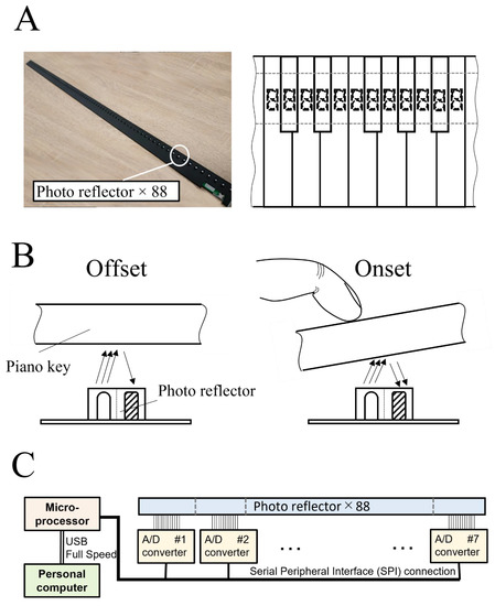 Piano playing can be one of the most representative dexterous skills to perform [14,15,16,17]. Previous studies developed some sensors, such as pressure sensors that were placed on the bottoms of the keys [18], force sensors that were implemented on the key surfaces [19,20,21,22], and custom-made data gloves [6,23,24], which successfully recorded the motions and/or force of the piano keys and fingers at high spatiotemporal resolution. However, none of these original sensors were no-contact sensors that enabled the recording of key motions without altering the touch sensation. In contrast, the noncontact sensing technology that has been used most frequently in previous studies was the Musical Instrument Digital Interface (i.e., MIDI) [25,26,27,28,29,30,31,32,33]. This technology captures timing and seven-bit quantized key speed at only two discrete events of the key motion, the moments when the key is depressed and released [34], which provides no high spatiotemporal resolution and, therefore, fails to capture various features of fine motor control.