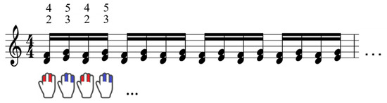 The experimental apparatus consisted of a Yamaha acoustic piano (U1) and the sensing system. Figure 2 shows the experimental task requiring the repetition of two sets of simultaneous keystrokes of the two keys, leaving one white key in between (i.e., a major third interval), using the right index and ring fingers for one set and the right middle and little fingers for another set. Participants were asked to perform the task for 6 s as fast and accurately as possible and at a paced tempo (100 bpm) with a predetermined loudness (i.e., mezzo forte), which was provided as a sound stimulus from the speaker located in front of the participant. We used this task because such a chord-trill task, which has been included in various musical pieces (e.g., Etude Op.25 no.6 by Frederik Chopin, Ondine by Maurice Ravel, Piano Sonata No.3 1st mov. by Ludwig van Beethoven), is known to be technically challenging to play quickly and accurately.