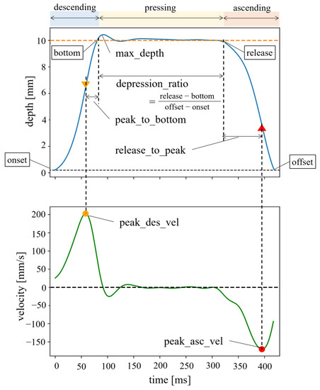 Definitions of the six characteristics of the key-depressing and key-releasing motions. (i) peak_des_vel: peak descending velocity during key depression, (ii) peak_asc_vel: peak ascending velocity during key release, (iii) max_depth: the maximum key-moving distance during key depression, (iv) peak_to_bottom: the time difference between the moment when the key reaches its peak descending velocity and the moment when the key reaches its bottom during key depression, (v) release_to_peak: the time difference between the moment when the key leaves from its bottom and the moment when the key reaches its peak ascending velocity during key lift, (vi) depression_ratio: the ratio of the duration when the key touched the bottom relative to the duration between the onset and offset of key motion.