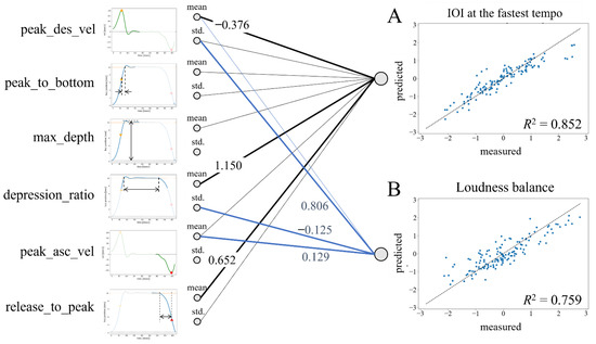 Schematics of the results of the penalized regression explaining the interindividual variance of each of the IOIs at the fastest tempo and loudness balance across the participants. (A) R2 of the regression model for the IOI at the fastest tempo was 0.852. The individual differences across the pianists of the IOI at the fastest tempo were mostly accounted for by the inter-strike mean of the peak descending velocity of the key, the inter-strike mean of the key-depression ratio, and the inter-strike mean of the time to key release. (B) R2 of the regression model for the loudness balance at the paced tempo was 0.759. The individual differences across the pianists of loudness balance was mostly accounted for by the inter-strike variability of the peak key descending velocity, the inter-strike variability of the key depression ratio, and the inter-strike mean of the peak ascending velocity of the key.