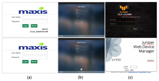 - Cheng, H.; Dong, W.Y.; Zheng, Y.; Lv, B. Identify IoT Devices through Web Interface Characteristics. In Proceedings of the IEEE 6th International Conference on Computer and Communication Systems (ICCCS), Chengdu, China, 23–26 April 2021; pp. 405–410. [Google Scholar]