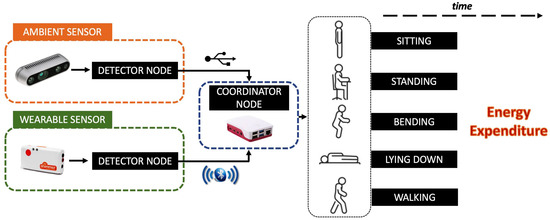 Schematic representation of the proposed platform for EE quantification. Two different sensor technologies (ambient and wearable) transmit high-level information (e.g., posture label with timestamp) to a coordinator node.