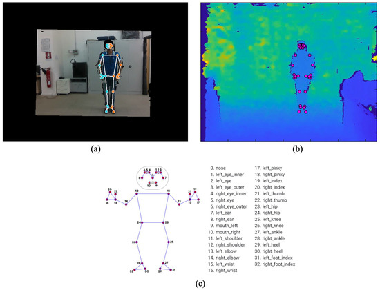 The RGB (a) and depth (b) frames and, then, the 33 landmark BlazePose model (c) used to define postural features.