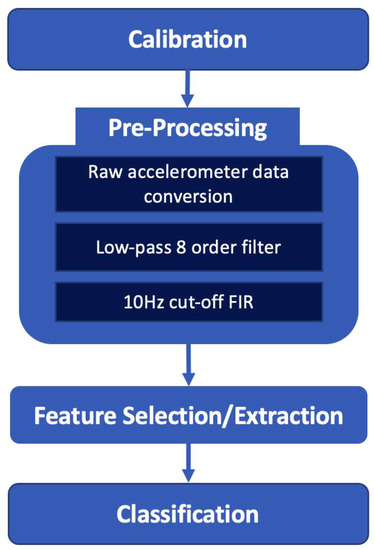 The acceleration data on three axes were sent to a Raspberry Pi 4 and processed with a software developed in Python programming language. The most relevant phases of the software framework are summarized in Figure 6.