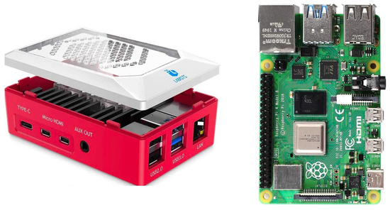 Elaboration unit (Raspberry Pi 4 Model B) for the acquisition and processing of sensory data and the fusion of high-level information classified by sensor nodes. Used case on the left and electronic board on the right.