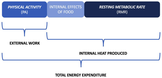 Total EE composition. It is composed of three major components: physical activity (PA), the internal effects of food and Resting Metabolic Rate (RMR).