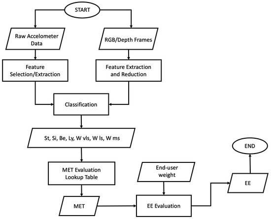 Flowchart clarifying the implemented platform’s operation. The information processed by the sensory nodes integrated in the platform classifies, after the data fusion step, four different postures and walking activities at three different speeds. Using lookup tables for MET and weight of the end-user, it is possible to quantify EE.