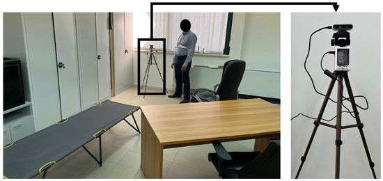 The experimental design can be seen in Figure 10. A typical living environment was replicated within the laboratory, in which, there is a chair, an additional and partially visible chair positioned behind a desk, a bed and a space for walking. The performance of each detector involved in the actual version of the platform was estimated by using a common experimental setup in which the participants were asked to perform a predefined set of postures and walking activities. During such experimental sessions, data were collected simultaneously by ambient-installed camera and by the smart device worn by each participant. In order to obtain feedback on their walking velocity, each user wore a smartwatch that displays this on the screen.