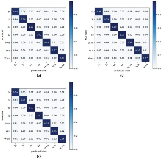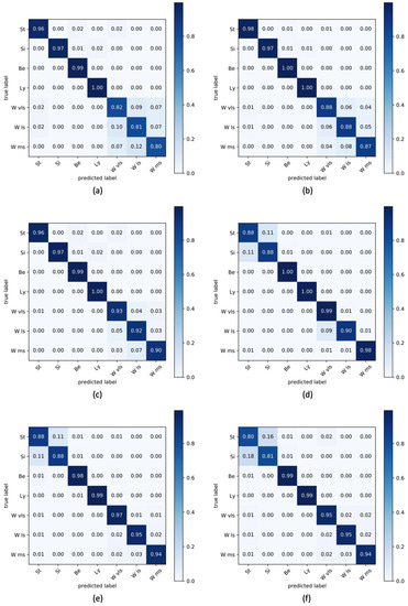 Confusion matrices for seven classes of posture and walking activities for ambient (a–c) and wearable (d–f) sensors.