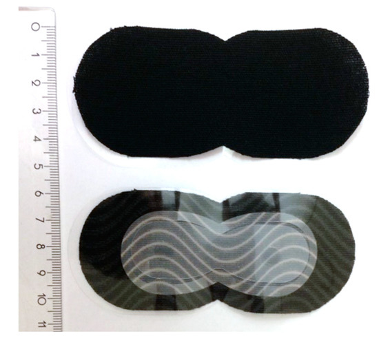 The passive patch (Figure 4) consists of three materials: a stretchable fabric sports tape (Ultra Performance Kinesiology tape, Mueller Sports Medicine Inc., Prairie du Sac, WI, USA) cut into 4.5 cm wide, and 11.2 cm long patches that are large enough to cover the paired modules and an additional space at the edge to ensure secure adhesion to the skin. In the center of the sports tape patch is a thin polyurethane film (inspire® 2150, Transcontinental, Montreal, QC, Canada) that forms a non-adhesive interior. To facilitate the application of the wearable device, two adhesive dots made of adhesive silicone gel (Silbione 45, ELKEM, Oslo, Norway) were placed inside to cover the adhesive area and the gripping points. The patch is attached to a protective liner.