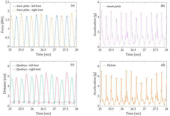 Examples of signals acquired from (a) the Qualisys motion capture system, (b) the S2P bilateral force plates, (c) the Dytran accelerometers, and (d) the smart patch. The circles on the graphs represent the peaks and valleys from which the step rate was calculated.