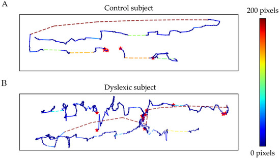Trial visualization example for (A) a control subject and (B) a dyslexic subject. The color of the line represents the line length in pixels according to the presented color scale and the red stars represent blink events.